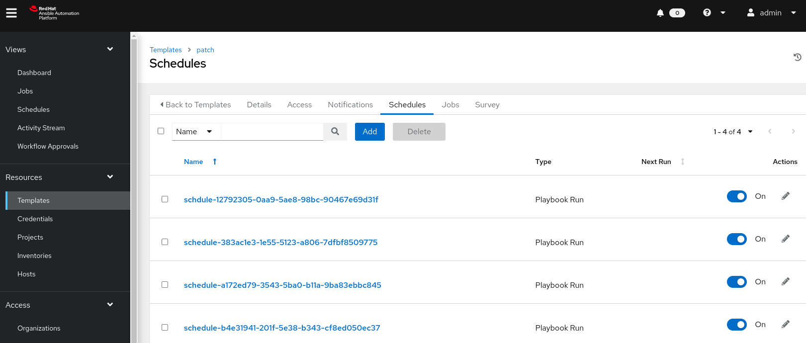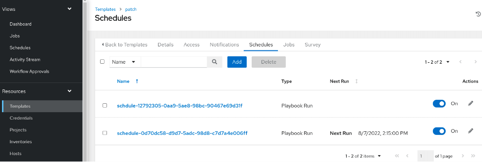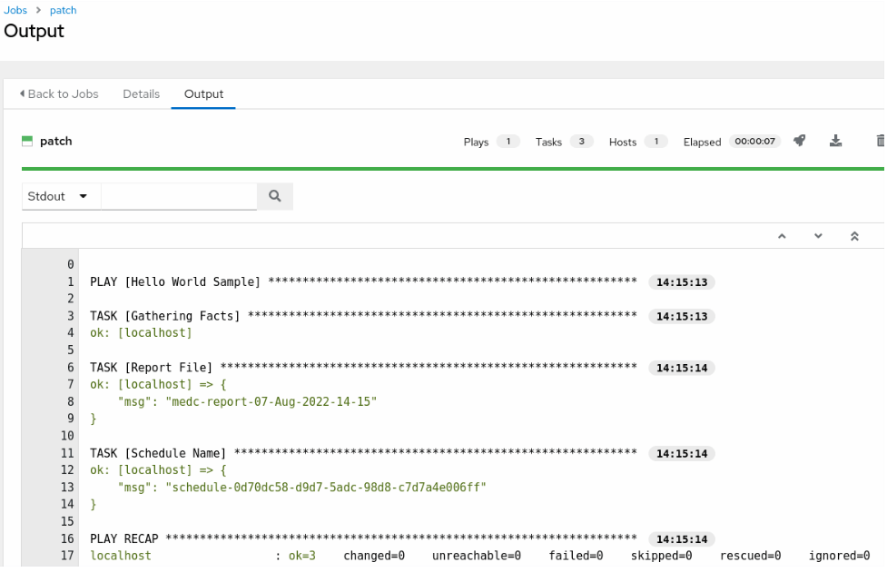The entire schedule (adding schedules, executing scheduled tasks and deleting schedule) cycle completes successfully. The input value can pass successfully from the beginning into the embeded “patch.yaml” playbook. The above POC codes can be used for real schedule tasks.