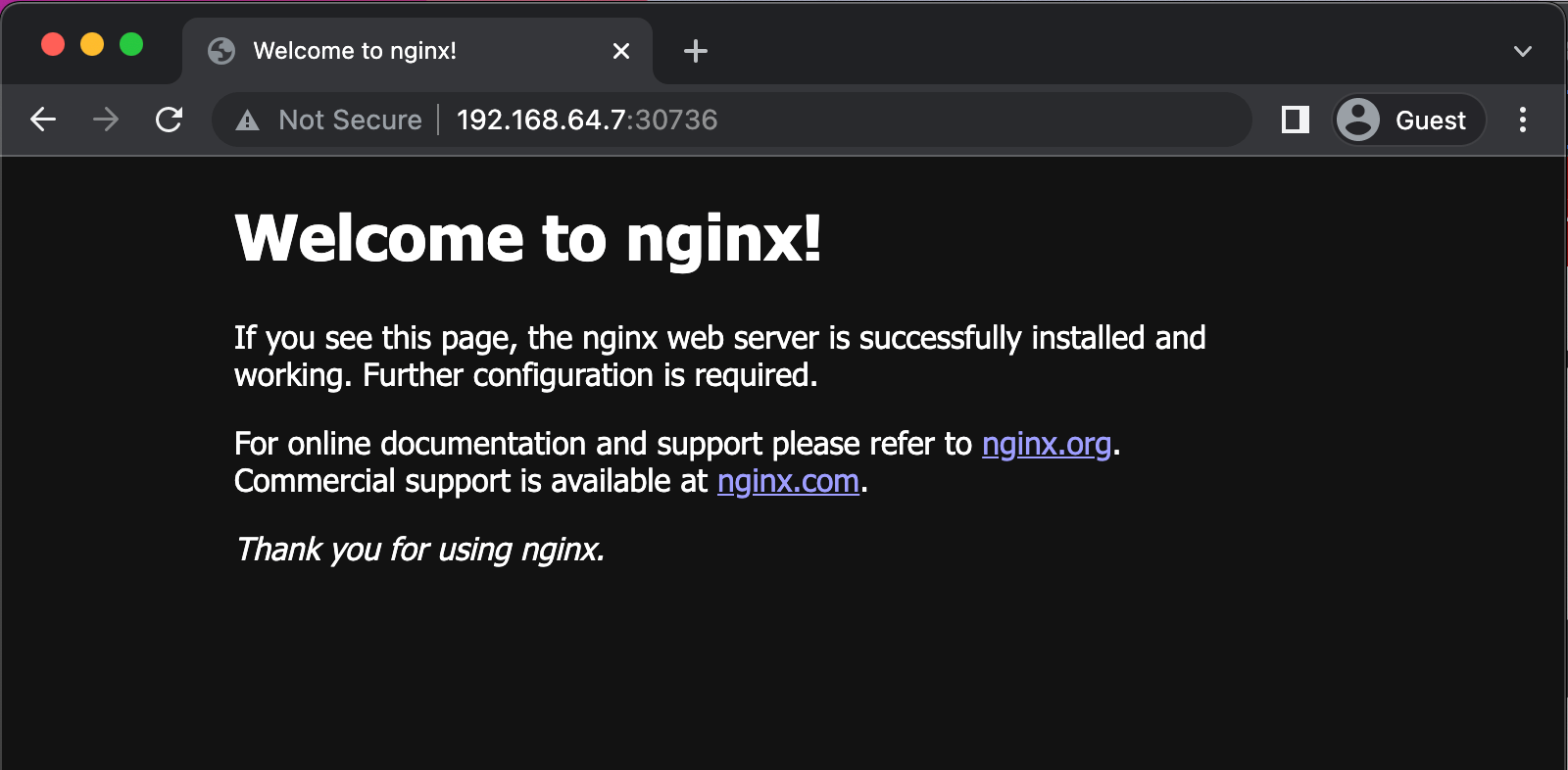 Now you know the IP address and port to be used to access the nginx application. In this case, 192.168.64.7 is the IP address of minikube which you can also retrieve using the command minikube ip.