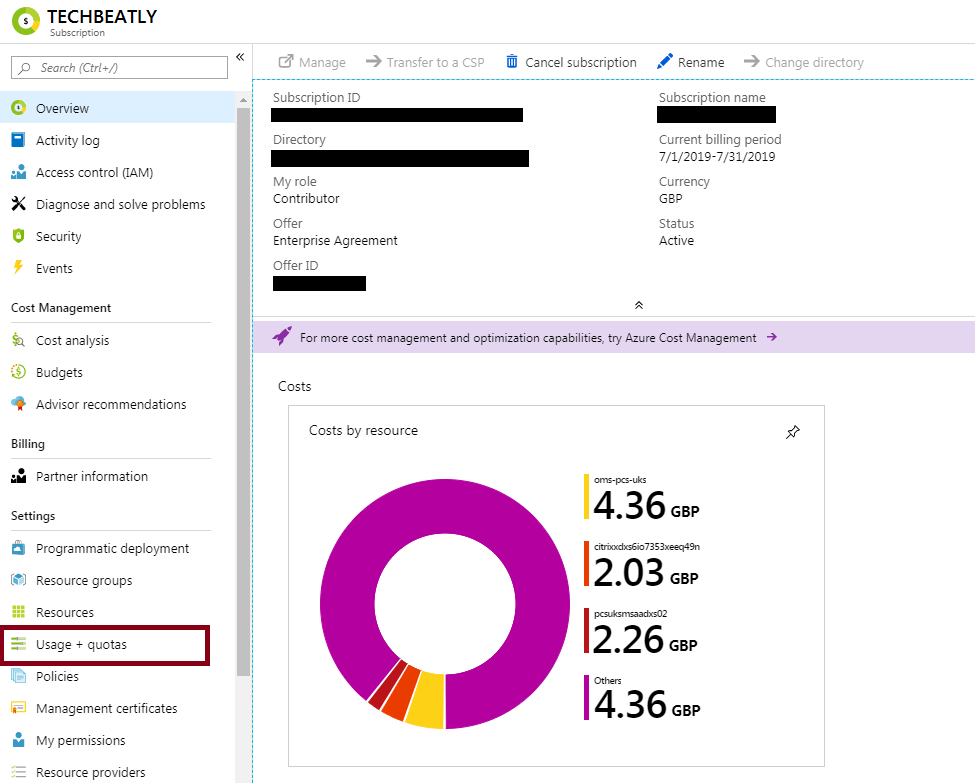 On the Subscription screen, you can see the usage, cost summary etc. Now, select Usage + Quota tab as shown below.