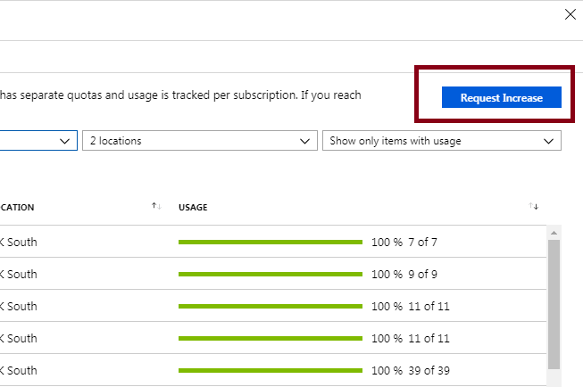 It will show current Usage and Limit of each resources items in all locations, as show below. Now filter out the resource type you want to see and update quota. Add more filters like Locations etc and see what is the usage and limit for your resources.