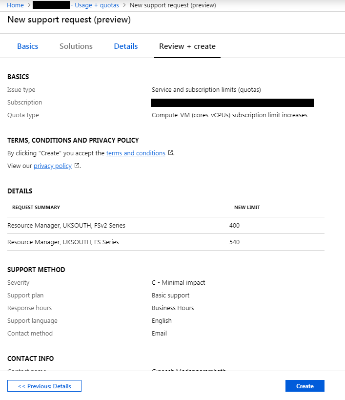 Let’s say you want to increase the quota limit for FS Series and FSV2 Series CPU’s in UK South (Europe) region, we can request the same. Find Request Increase button on upper right corner of the window as show below.