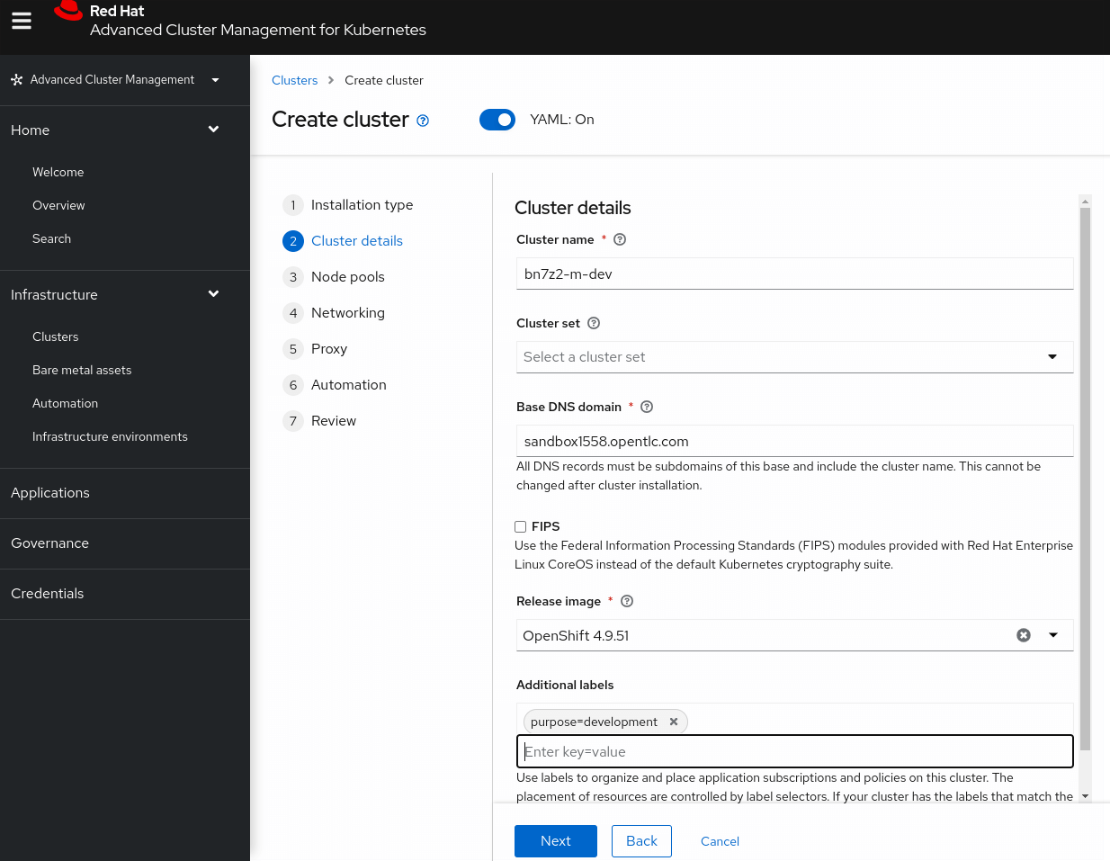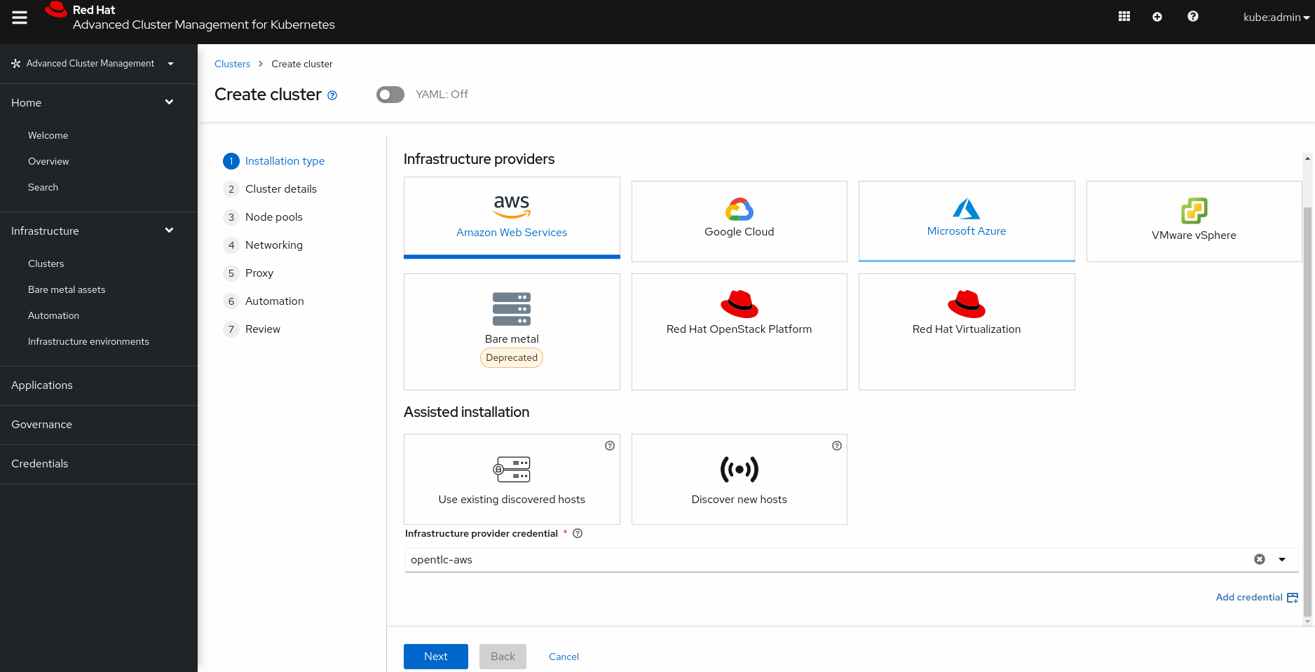 - Select the credential you created earlier as your Infrastructure provider credential (opentlc-aws).