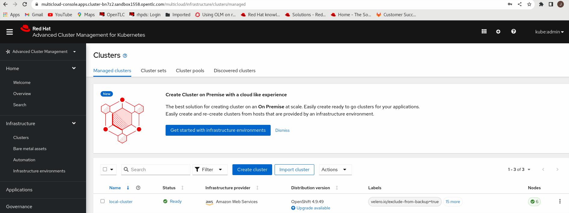 From the Infrastructure menu, click Clusters. Scroll down to locate the managed clusters. Notice that the local-cluster cluster-bn7z2.sandbox1558.opentlc.com cluster, where the hub cluster runs, is automatically managed.