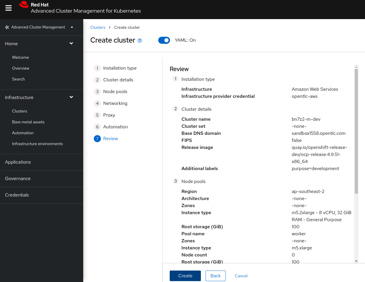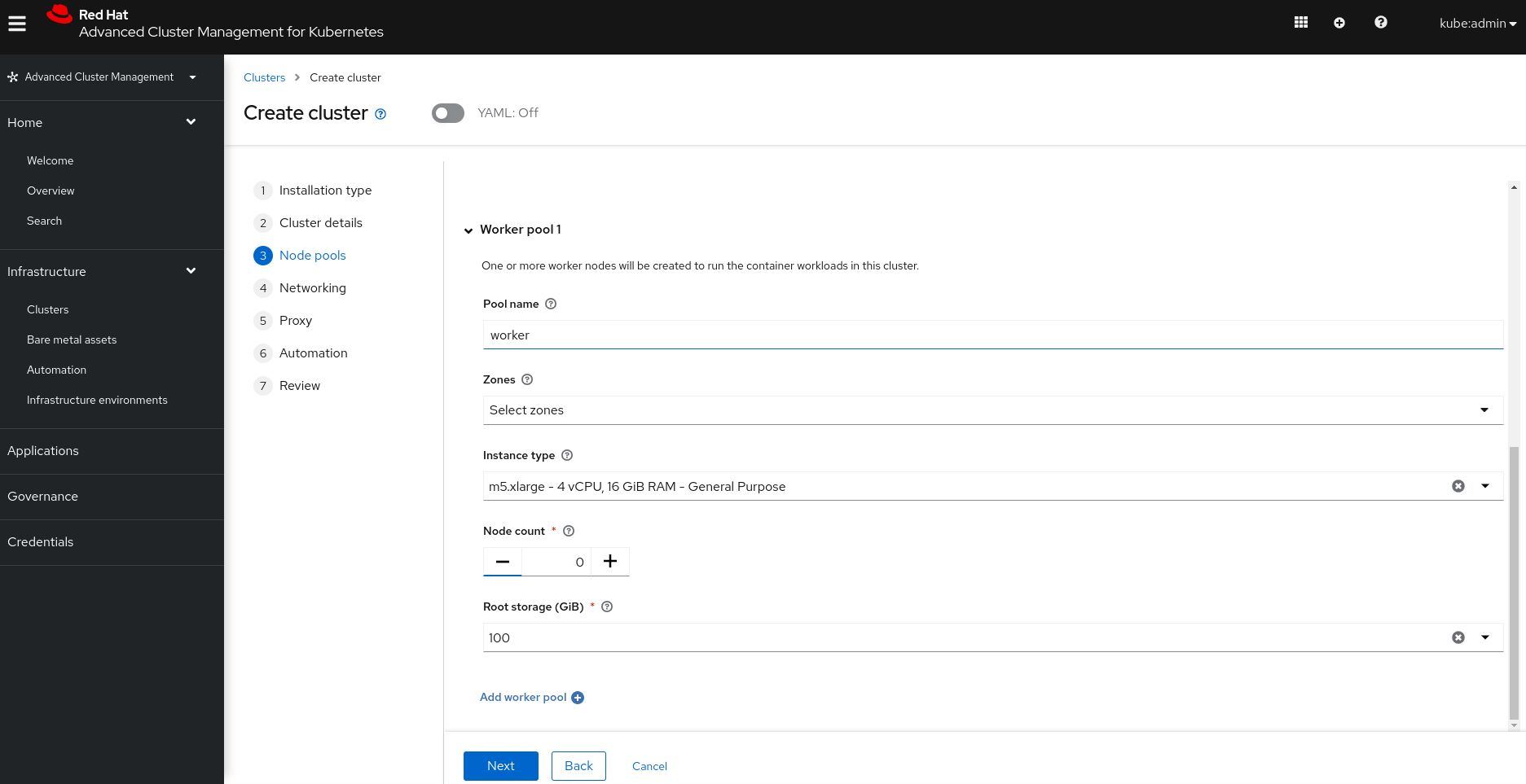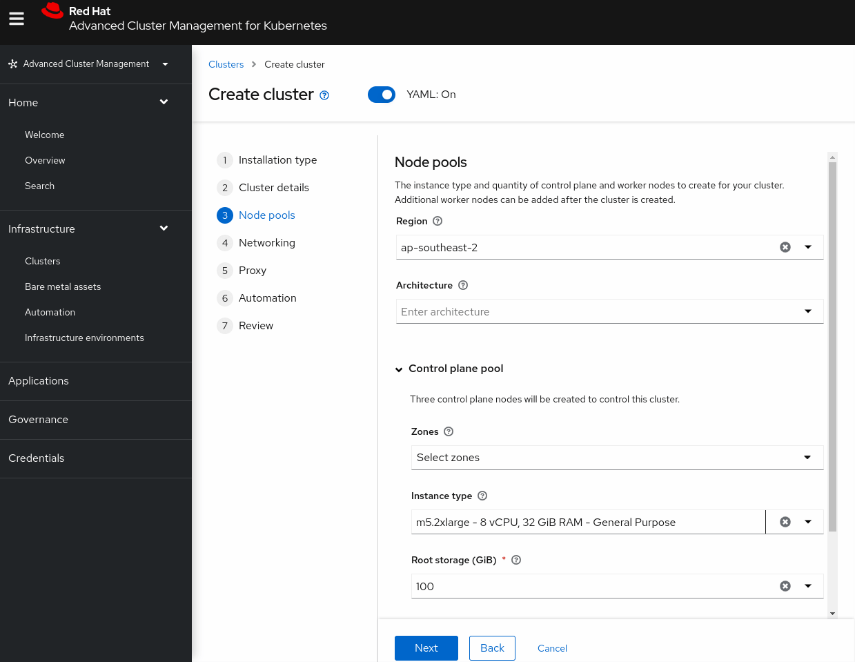 - For Node pools, specify the following parameters, and then click Next: Region: ap-southeast-2 Architecture: (do not set) Control plane pool → Zones: (do not set) Control plane pool → Instance type: m5.2xlarge Control plane pool → Root storage: 100 (do not change) Worker pool 1 → Pool name: (do not change) Worker pool 1 → Zones: (do not set) Worker pool 1 → Instance Type: m5.xlarge (do not change) Node Count: 0