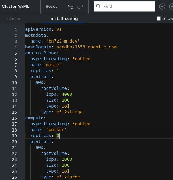 - In the YAML editor switch to the install-config tab, then change the number of replicas for the control plane to 1 and verify that the number of replicas for workers is set to 0.