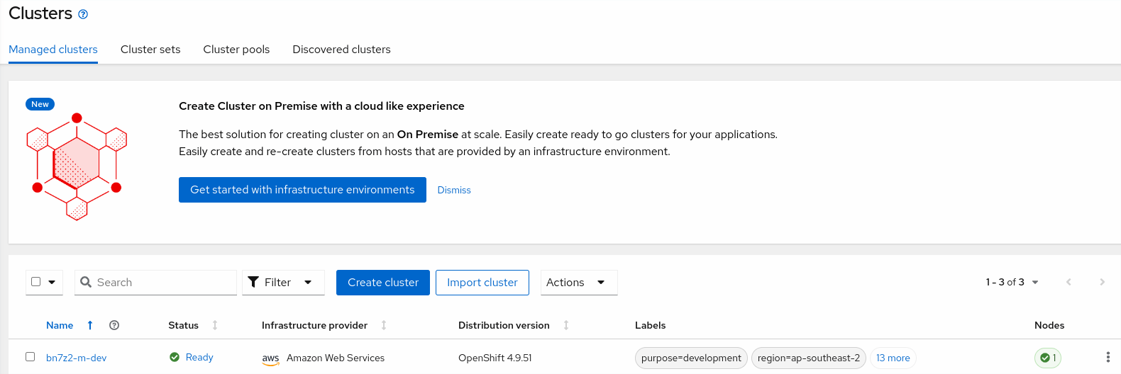 I deploy one managed OpenShift cluster for development. Because you do not actually use these clusters for any productive work, you deploy single-node OpenShift (SNO) clusters. These clusters consist of only a single VM that acts as the control plane and worker.