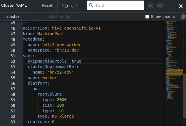 - Find the MachinePool YAML resource in the editor and add skipMachinePools: true under the MachinePool spec.