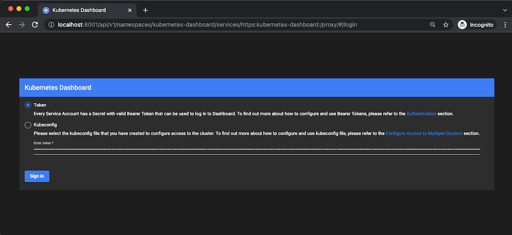 Now you can open the url http://localhost:8001/api/v1/namespaces/kubernetes-dashboard/services/https:kubernetes-dashboard:/proxy/ from you host machine browser (Port forwarding has been enabled as part of Vagrantfile ) and login with the token which you have copied from previous command.