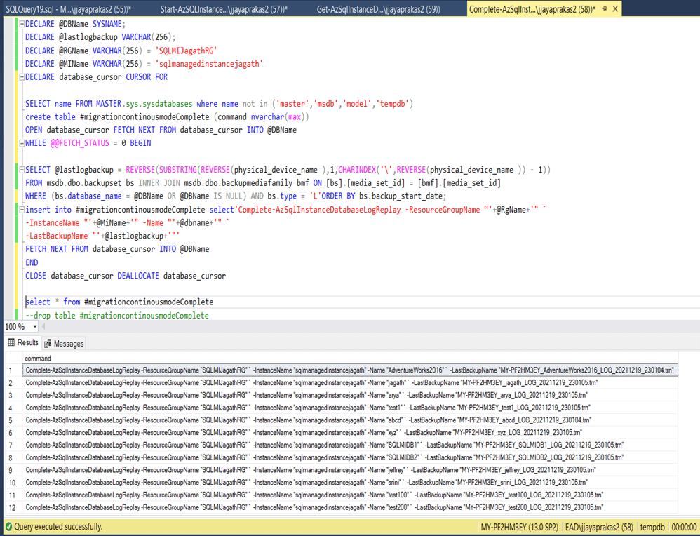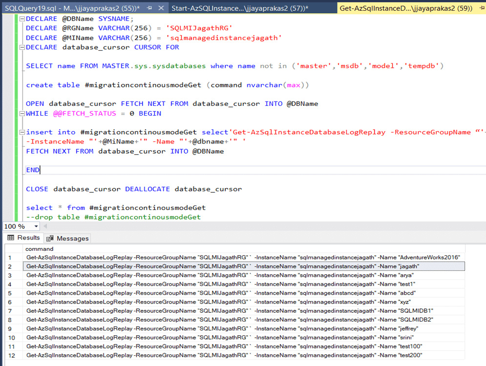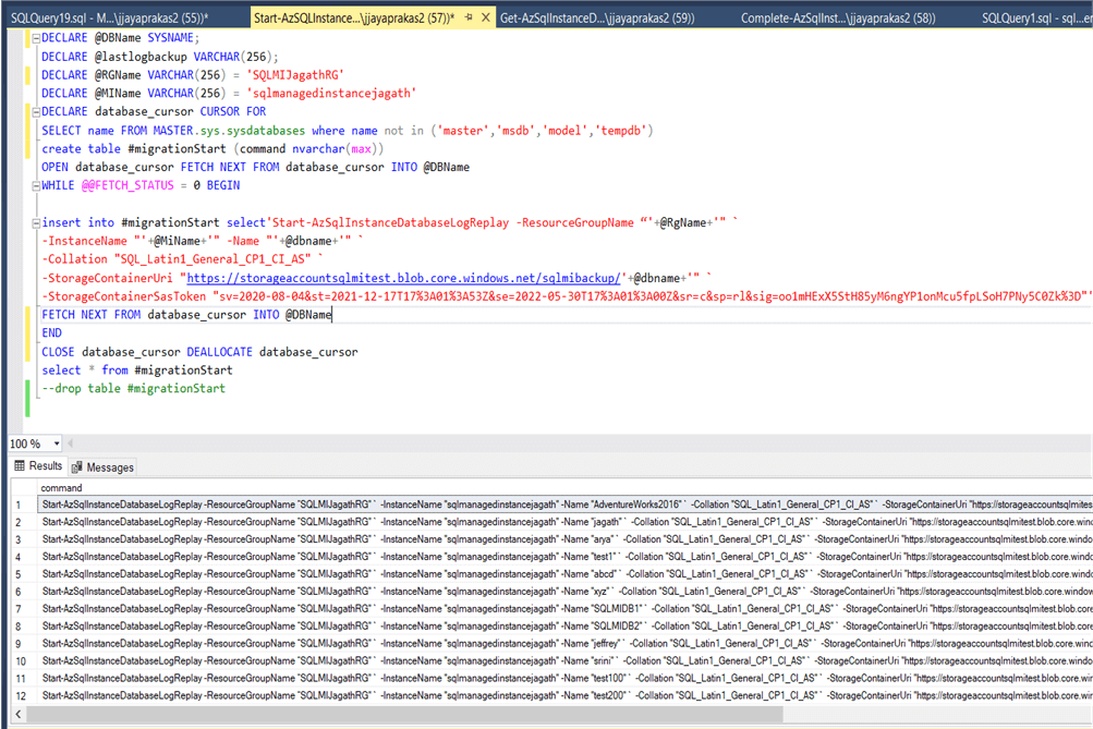insert into #migrationStart select'Start-AzSqlInstanceDatabaseLogReplay -ResourceGroupName “'+@RgName+'" `