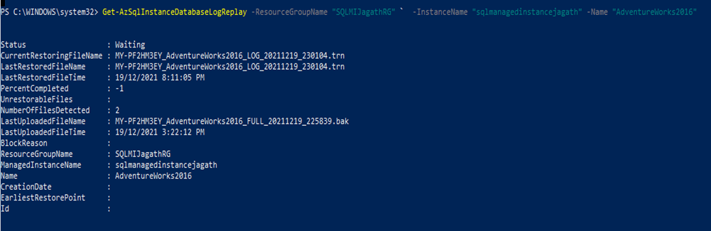 insert into #migrationcontinousmodeGet select'Get-AzSqlInstanceDatabaseLogReplay -ResourceGroupName “'+@RgName+'" `