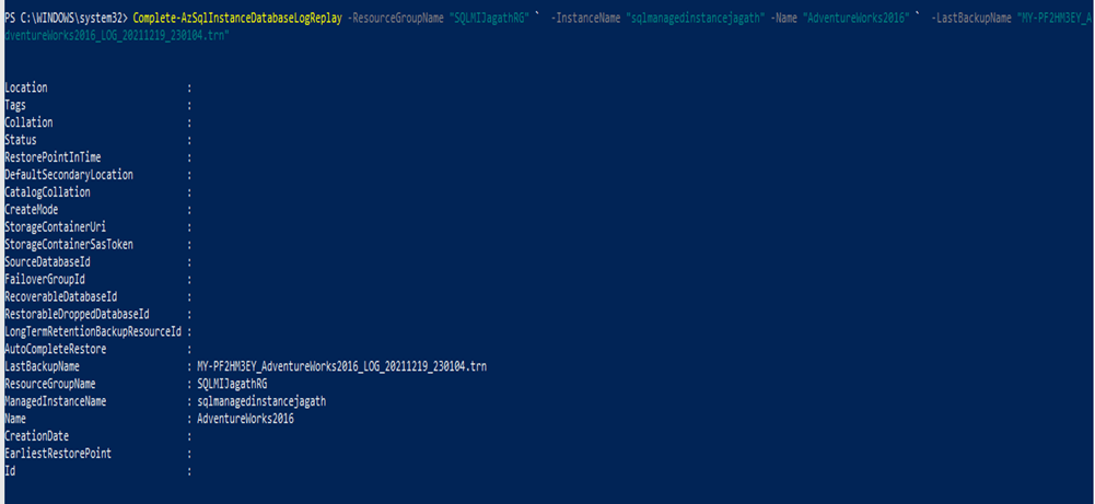 insert into #migrationcontinousmodeComplete select'Complete-AzSqlInstanceDatabaseLogReplay -ResourceGroupName “'+@RgName+'" `