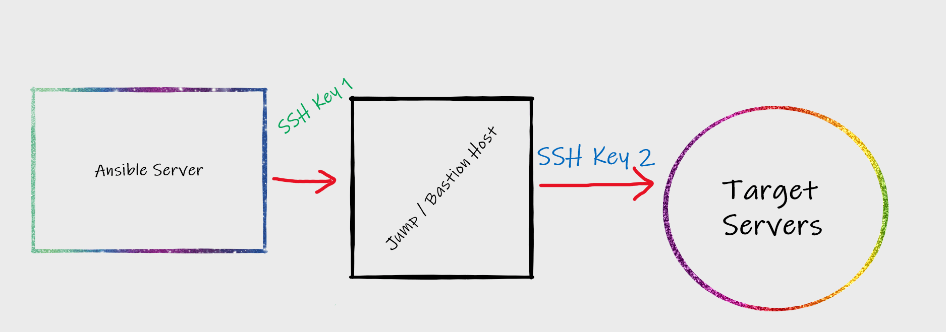 Now, I have defined a parameter ansible_ssh_user . This will tell Ansible that when you connect from jump host to target servers, use that user. If you don’t define any user here, Ansible will assume that you are running the command as root user. If you want to run as root user, then your SSH Key 2 should be root user key of the jump host.