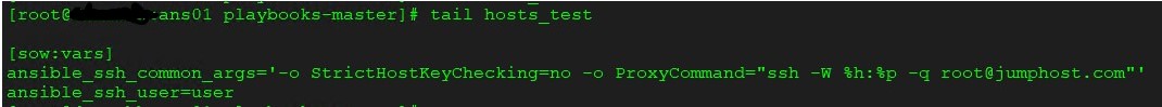 In this section, you have to define 2 variables. First one is ansible_ssh_common_args and second one is ansible_ssh_user . The common argument parameter will define SSH proxy for all hosts defined under that host group. If you want strict host key checking to be enabled, you can remove the line -o StrictHostKeyChecking=no , as shown above. Otherwise you can leave that as it may help if you have any failure with running playbooks.
