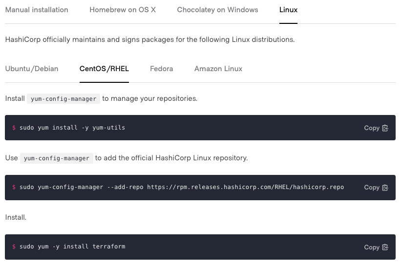 You can download the Terraform software from HashiCorp’s download page and use native installation methods for your operating system. Also you can install Terraform using the package managers like yum , apt , homebrew , Chocolatey ( choco ) etc. Refer install Terraform page for the appropriate method for your operating system.