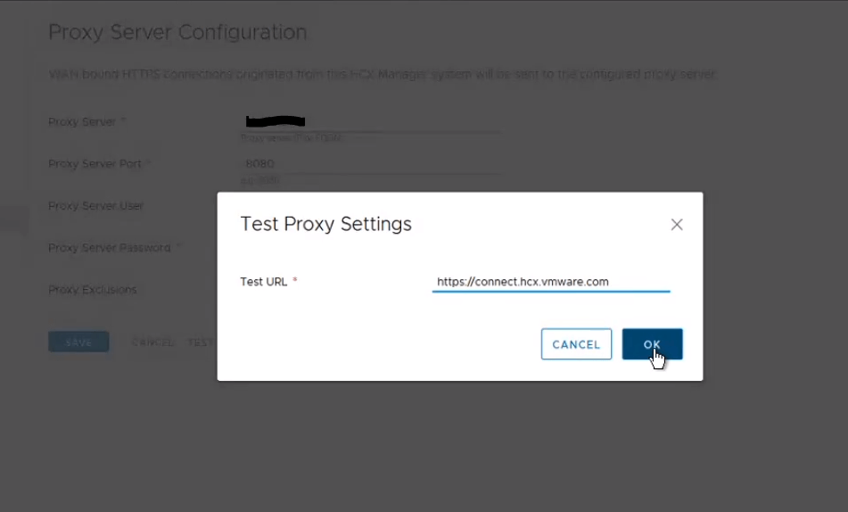 Enter your proxy information. Remember to exclude all local IP’s, vCenter IP’s. Before clicking save, click test connection button.
