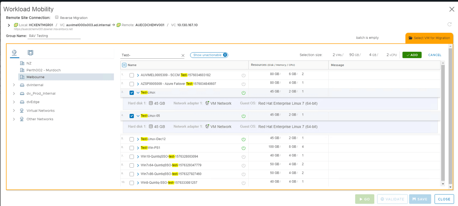 To initiate RAV job, select the target vCenter ( a.k.a remote vCenter ) from HCX Migration window first. Then search for the VM as shown in the picture below:
