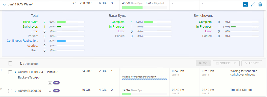 This is a low down-time method of migration type. As the name mentions, we can trigger a maximum of 100 bulk migration job at a time and can switchover these. In bulk migration, you can trigger the data sync as early as possible and can schedule a switchover window at any time future. Your data will start to sync to the target site. Once the initial data sync ( base sync ) completed, it will continue to sync delta until the its switchover schedule window has come.